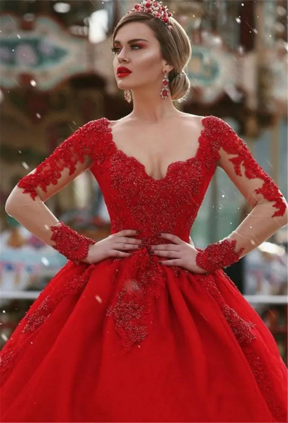 New Red Ball Gown Formal Evening Dresses Women Elegant Robe De Soiree Long Sleeves Satin Lace Appliques Prom Long Maxi Dress